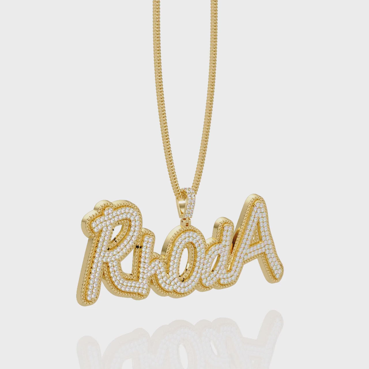 Elevate your style with this luxury iced-out custom name pendant necklace featuring the name Rhoda in bold script. Crafted in shimmering gold and encrusted with sparkling VS1 round lab grown, this personalized necklace makes the perfect statement piece for hip hop fashion, special occasions, or a unique gift.